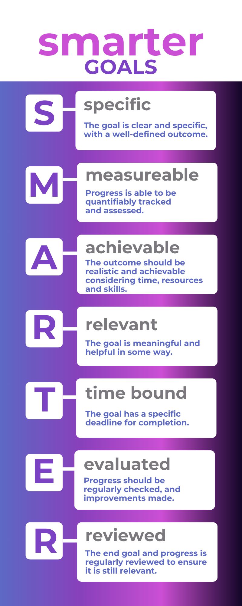 The SMARTER framework reveals your why, giving you step by step strategic actions to aim for.