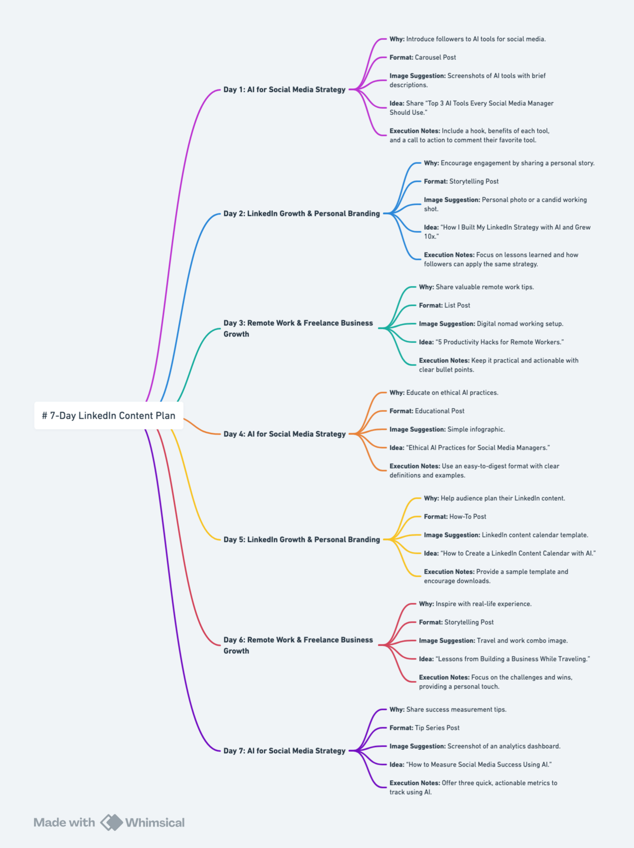 You are a social media strategist. Using my messaging and content pillars, plan 7 days of LinkedIn content. Create a mindmap, for each post provide the Why (purpose), Format (post type), Image Suggestion, Idea, and Execution Notes.